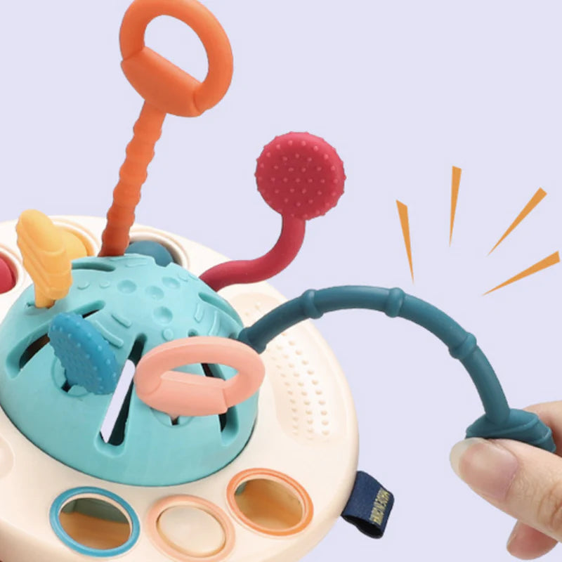 The UFO Montessori pull toy not only keeps your baby entertained for hours but also improves dexterity and hand-eye coordination in a playful way! Through pulling, pressing, and feeling this unique toy, your child learns to perform precise movements.